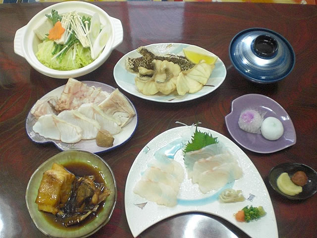 | Aコース クエ鍋 + 雑炊、フルーツ、漬物 |